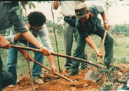 On March 16, 1998, the 30th Anniversary of the massacre at My Lai a simple groundbreaking was held at the site of the future My Lai Peace Park. After the extensive ceremonies at the My Lai Memorial we all then walked a mile or so the site of the My Lai Peace Park. Speeches were then given by Vietnamese officials and Mike Boehm expressing the hope for a peaceful future relationship between our two countries which this new Peace Park represents. After that Hugh Thompson, Larry Colburn and our Vietnamese counterparts, planted Mango trees, new life to arise out of death.